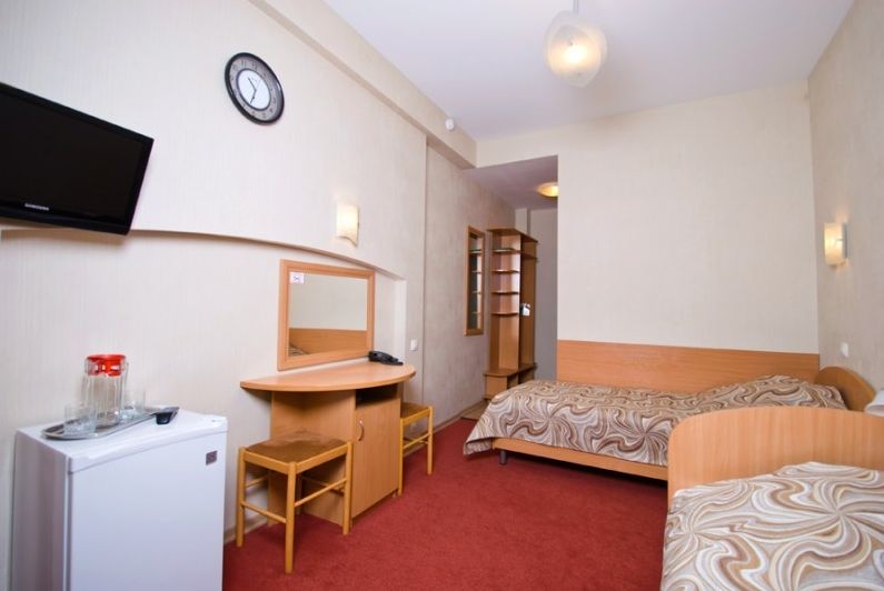Оборудование номера: две односпальные кровати, прикроватные тумбочки, шкаф для одежды, стол со стульями, телевизор, холодильник, электрочайник, телефон