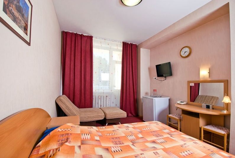Оборудование номера: кровать полутораспальная, прикроватная тумбочка, шкаф для одежды, стол со стулом, кресло, телевизор, холодильник, электрочайник, телефон