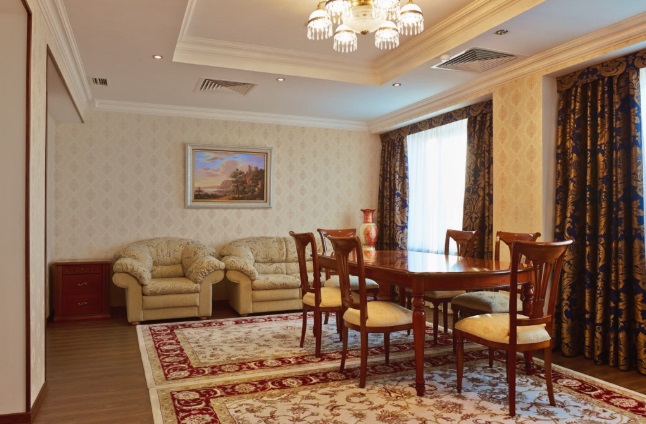 В номере: три комнаты: спальня, гостиная, столовая зона, двуспальная кровать, тумбы прикроватные, стол, стулья, обеденная группа, мягкая мебель, телевизор с кабельным телевидением, холодильник, сейф, электрический чайник, телефон, кондиционер