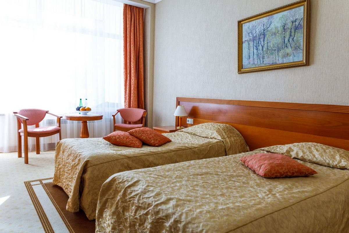 Оснащение номера: две односпальные кровати, прикроватные тумбочки, стол, стулья, журнальный стол, шкаф для одежды, холодильник, телевизор, сейф, интернет Wi-Fi