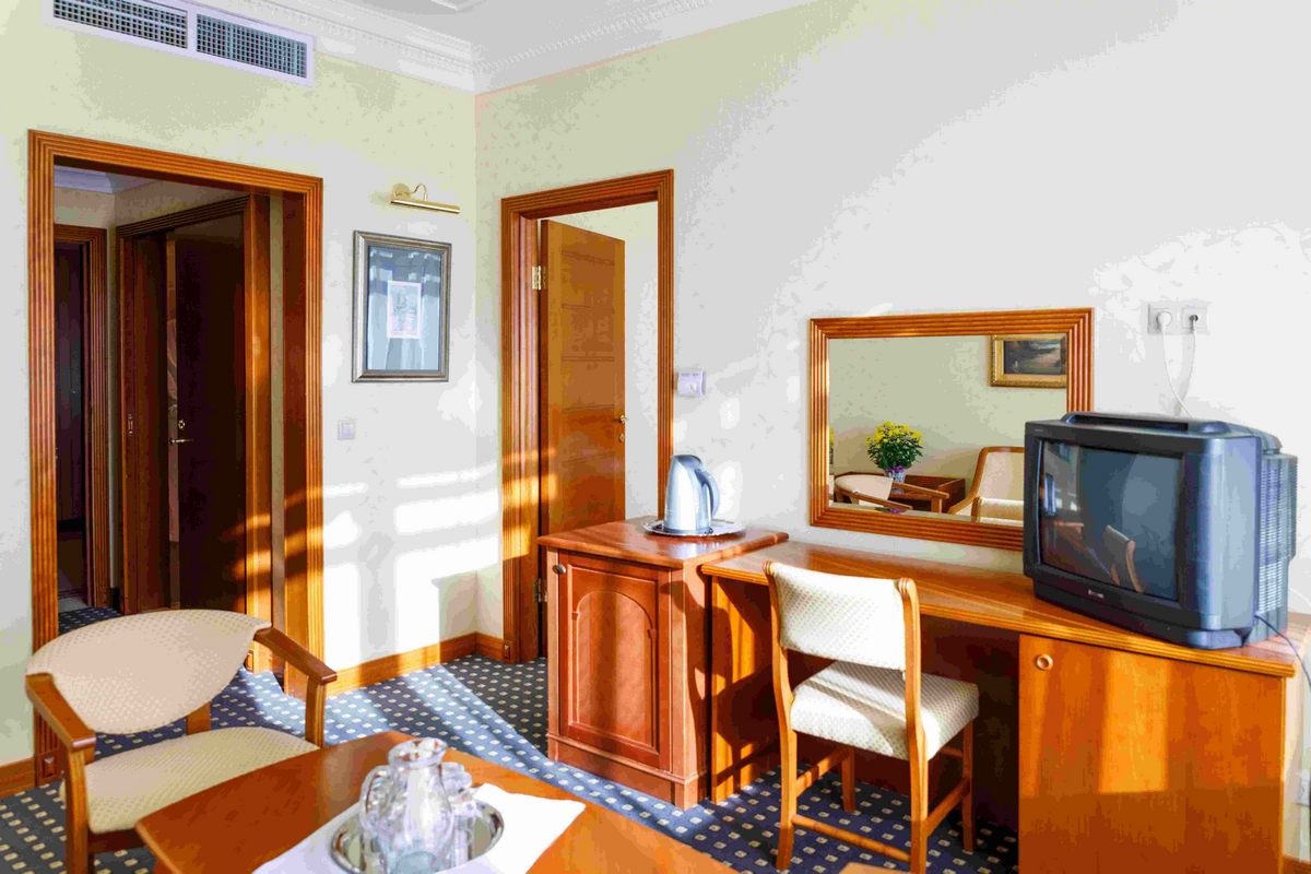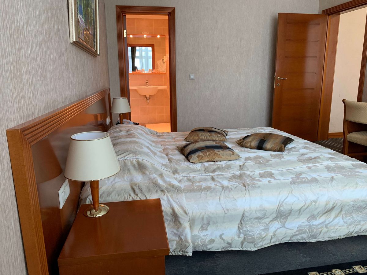 Оснащение номера: двуспальная кровать, прикроватные тумбочки, стол, стулья, журнальный стол шкаф для одежды, диван, холодильник, телевизор, сейф, интернет Wi-Fi